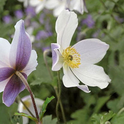 Анемона Дикий Лебедь японская - уникальный гибрид! Цветет она с середины июня до ноября, то есть дольше всех прочих японских анемон! Белоснежные цветки с тремя внешними лепестками, имеющими широкие фиолетово-голубые полосы на оборотной стороне, достигают 7,5 см в диаметре. Утром и вечером цветки закрываются, превращаясь в голубые «колокольчики» с поникшими головками. А днём они раскрываются, представляя на всеобщее обозрение яркие белоснежные «ромашки»! Отличное дополнение для альпинариев, садовых границ и бордюров, а также оригинальная срезка. Букет из анемон долго сохраняет свежесть.
