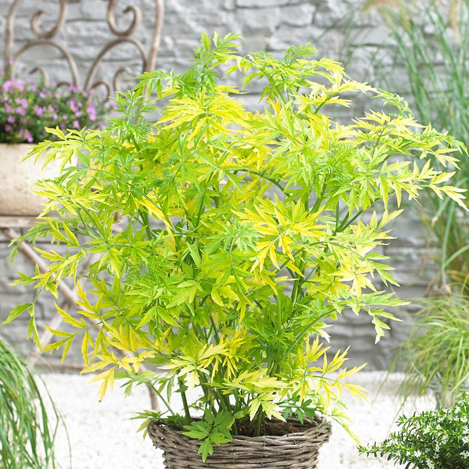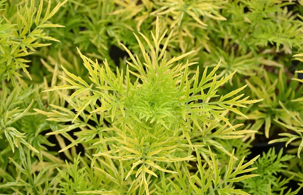 Листья сложные, резные, золотисто-желтые, глубоко рассеченные.