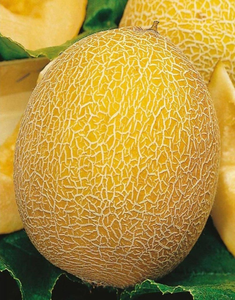 Дыня Galileo - среднеспелый гибридный сорт. На одном растении находится 2-3 небольших плода массой 1-1,5 кг. Форма плодов округлая, слегка сегментированная. Поверхность зеленая, с коричневой, нежной сеткой. Мякоть зеленоватая, нежная, толстая и очень ароматная.
