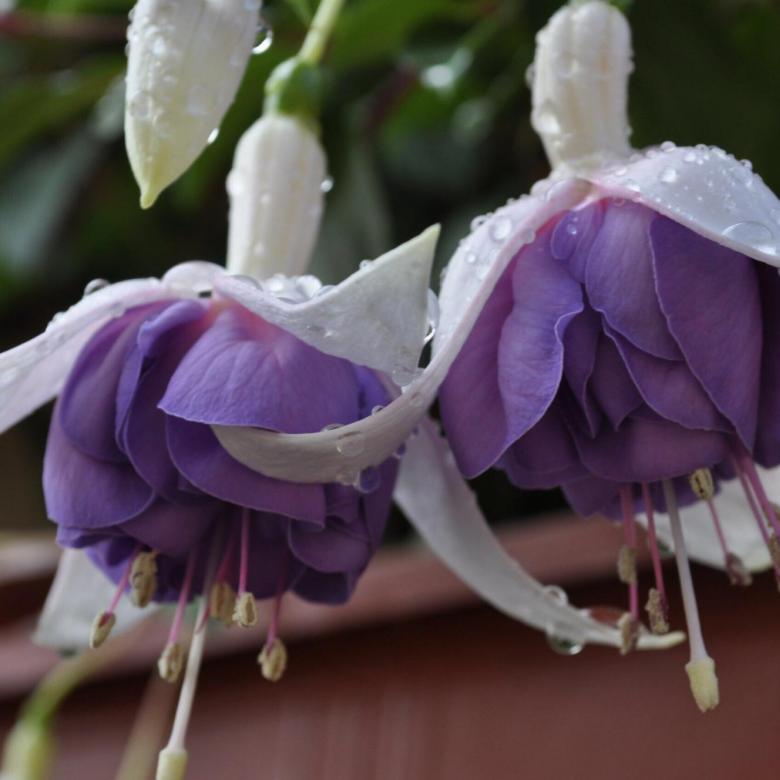 Фуксия Фей — ампельная форма фуксии. Бутоны крупные продолговатые. Чашелистики белые с зелеными кончиками. Юбочка темно-голубая. Цветки крупные, махровые. Средне-зеленые листья. Очень обильное и длительное цветение. Сорт не капризный, подходит новичков. Очень красивый сорт.