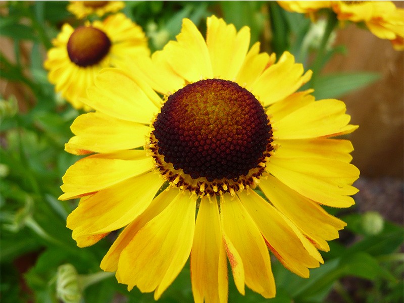 Один из лучших сортов гелениума. Цветки равномерно тёмно-жёлтые с коричневым центром. Нижняя сторона лепестков коричневатая. Цветет во второй половине лета, август - сентябрь.