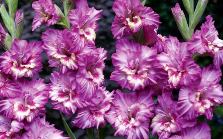 Бело-фиолетовые цветки с гофрированными лепестками достигают от 12 до 15 см в диаметре. Они формируются по 15-20 бутонов на каждом растении высотой 90-120 см и радуют беспрерывным цветением с июля до конца сентября. Соцветия насыщенного окраса отлично смотрятся рядом с другими сортами, прекрасно подходят для срезки в букеты. Страстный цветок поможет создать праздничное настроение при любой погоде, поэтому купите и посадите на своем участке луковицы гладиолуса гофрированного Танго.