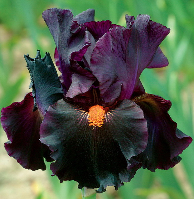 Ирис Dracula's Kiss отличается необычными оттенками пурпурно-черного цвета стандартами и фолами - как компот из черной смородины - и яркие оранжевые бородки. Не очень крупные, но очаровательные цветы.9-12 бутонов на одном цветоносе.Высота цветоноса 91 см. Срок цветения ранний.
