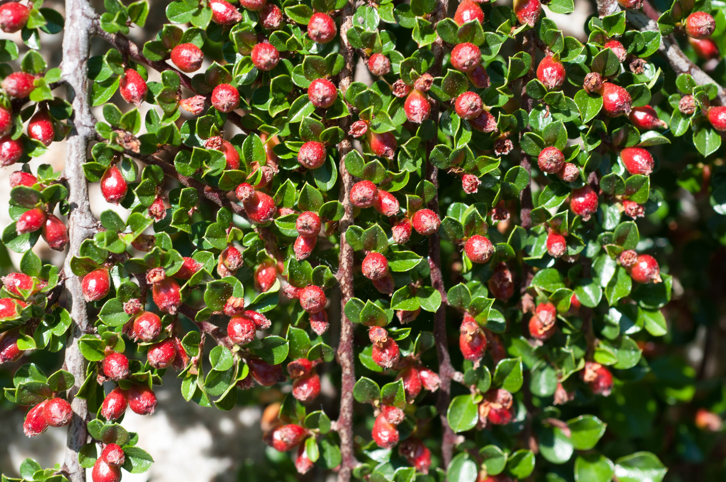 Листья блестящие, гладкие, мелкие, как и у других видов кизильник, осенью окрашиваются в ярко-оранжевые и красные тона.