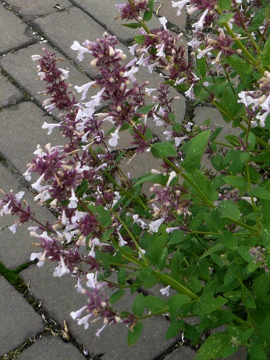Котовник Dawn to Dusk - белый цветок с присутствием темно-лилового цвета у основания и крепления к крепкому стеблю растения. Листва зелёная, овально-заостренной формы.