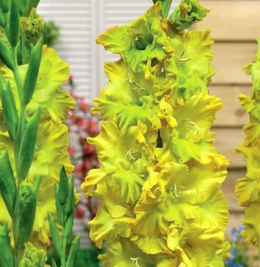 Гладиолус крупноцветковый Блитц - невероятно красивый и нежный цветок! Лепестки - желтые с лаймово-зеленоватым пятном и напылением, сильно гофрированные, как нарядные рюши. В солнечную погоду цвет очень ярко-желтый, а в пасмурный день краски смягчаются и цветы Гладиолуса крупноцветкового Блитц кажутся бело-желтыми.