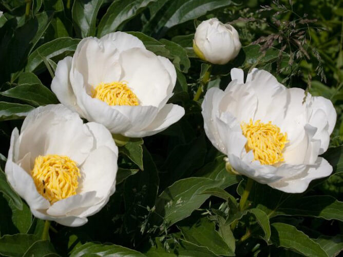Травянистый пион Jan van Leeuwen японский сорт, цветок насыщенно белый, махровый, чашевидный, плотной фактуры, диаметром 14 см. Ярко-желтые стаминодии образуют компактный шарик. Куст высотою до 70 см, компактный, стебли прямые, прочные. Ажурная пышная листва пиона этого сорта сохраняется до поздней осени, когда из темно-зеленой становится багряной. Средне-поздний срок цветения. Ароматный.