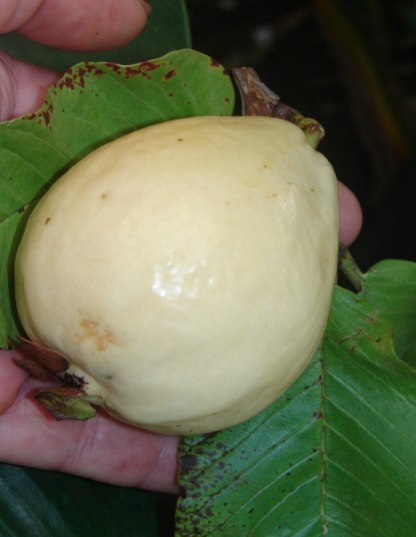 Psidium guajava Bassateen El Sabahia - небольшое дерево или кустарник с кожистыми листьями и мощной корой. Плоды диаметром 8-12 см, грушевидной формы, созревают от зеленого до желтого, а затем бело-кремового цвета. Мякоть плотная, белая, хорошего вкуса, с высоким содержанием аскорбиновой кислоты.
