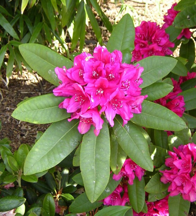 Рододендрон Dr. H. C. Dresselhuys - цветки воронковидные, крупные, темно-розовый с оливково-зелеными отметинами. Соцветия конической формы, очень крупные. Зимостойкий сорт, до -27 °С. Высота взрослого растения: 250 см.