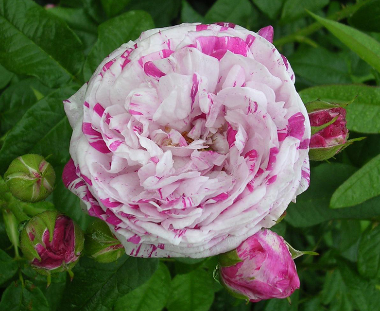 Роза Variegata di Bologna пользуется неизменной популярностью. Это нежно-розовая роза с малиново-пурпурными полосками и пятнами на лепестках. В жару полоски бледнее, но основной цвет всегда нежно-розовый. Цветки густомахровые, чашевидные, плотные, иногда квартированные. Появляются в тугих кистях (цветоножки короткие), по 3-5 шт. Листва обильная, крупная, тонкая, ярко-зеленая.