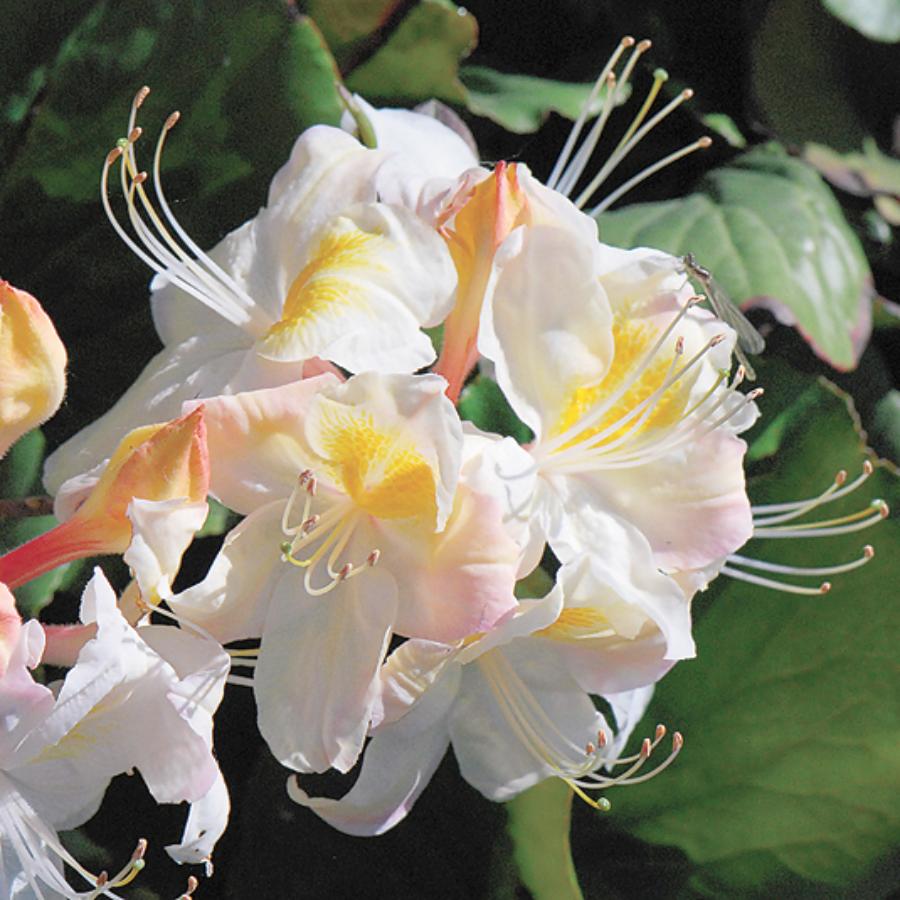 Азалия Silver slipper - красивоцветущий листопадный кустарник с округлой компактной кроной. Высота и диаметр взрослого растения - 1,5м. Листья блестящие, темно-зеленые, удлиненные, красно-бурые осенью. Цветки молочно-белые с золотым пятном цветки, очень крупные и обильные, собраны в соцветия. Цветёт сорт в конце мая - начале июня.