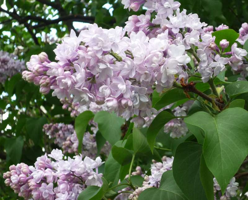 Сирень Polina Osipenko - куст средний, широкий, красивой формы. Цветение обильное. Бутоны нежно-лиловато-розовые. Цветки белые с очень нежным розовато-лиловым оттенком, крупные, диаметром 2,5 см, махровые — из трех сближенных венчиков, ароматные, лепестки округлые, заостренные, слегка загнутые, в нижнем ряду отогнутые. Соцветия размером 20 x 13 см, большей частью из одной пары цилиндрических, компактных метелок.
