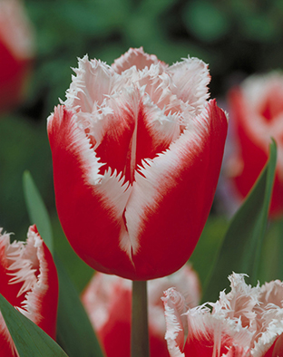 Тюльпан Canasta - нарядный и эффектный бахромчатый тюльпан, лепестки розово-красные с белоснежной бахромой по краю. Цветок располагается на цветоножке высотой 25-45 см. Высота бокала - до 8 см. В выгонке - чем больше срок охлаждения, тем выше будет цветонос. Срок цветения поздний.